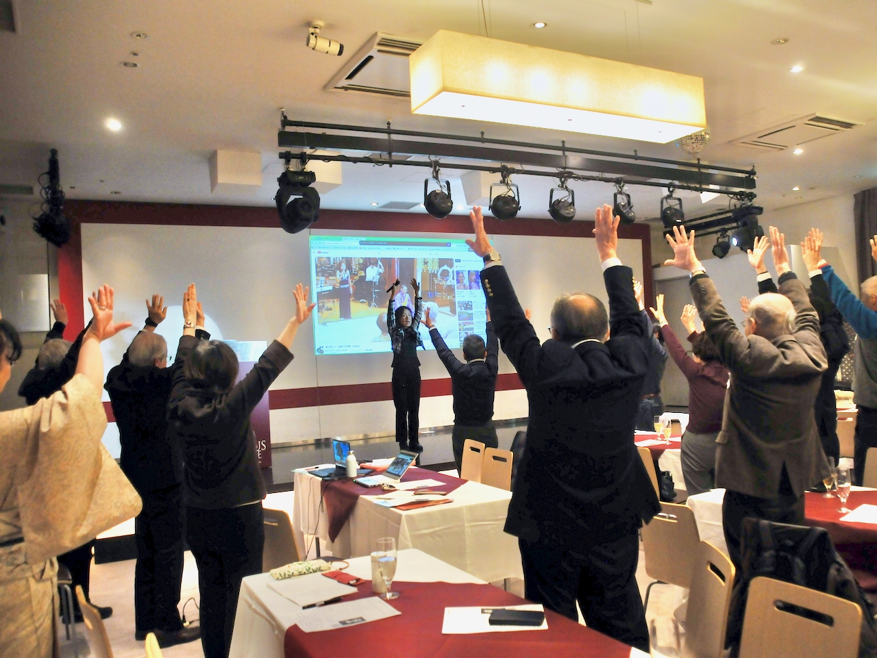 5.ご一緒にヴォーカルトレーニング講演会参加者とともに以下を実践。毎日やれば、声帯がリラックスして音域が広まり、声がはっきり出るようになる。医療的にも認められている。カラオケで歌う前、MC等で話をされる方にはお勧め。