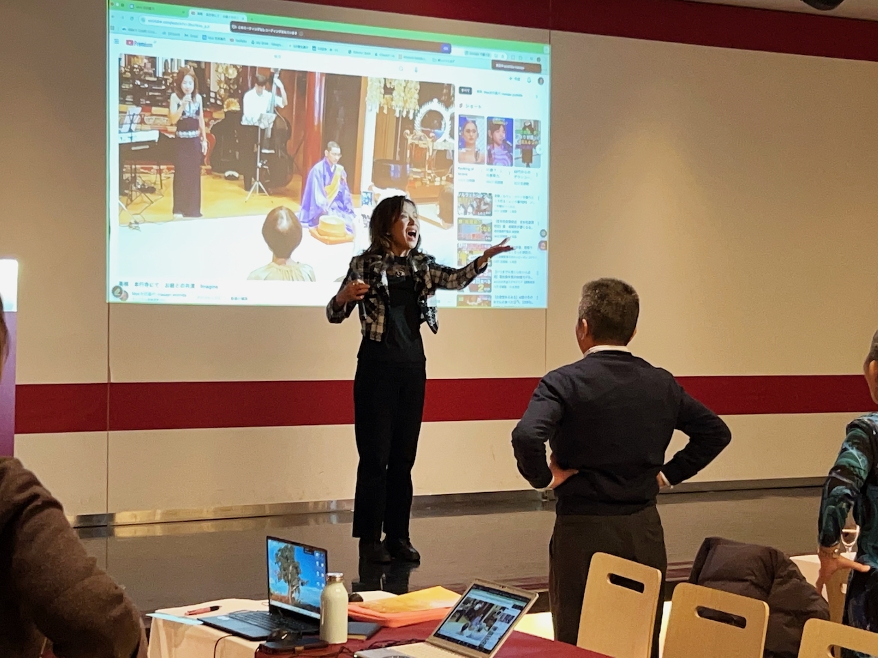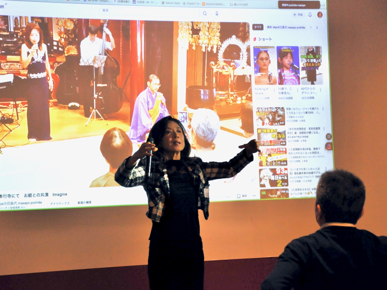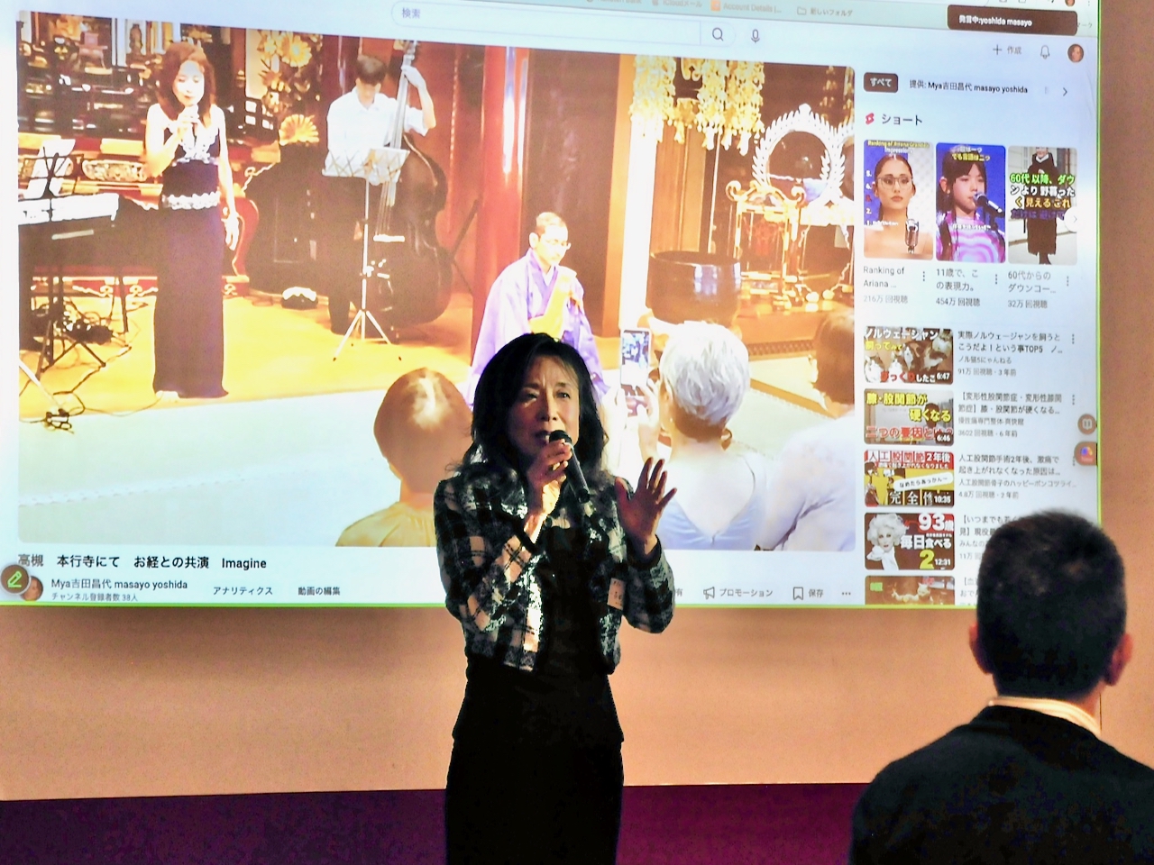 7.最後に今をみつめて生きたいとの思いで「今を生きる」をテーマに、山本能楽堂(ジャズと花道の競演「On the sunny side of the street」)やお寺(高槻本行寺/お経との共演「Imagine」)で演奏している(参照:Ⅸ.資料 吉田昌代さんHP)。